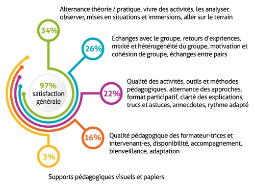 Le programme de formation est reconnu pour ses méthodes ancrées sur le terrain, permettant la mise en situation tout en garantissant l’apport de bases théoriques. Les temps d’échanges en groupe sont aussi très importants dans ces formations pour permettre la co-formation et les échanges de pratiques. La qualité des formateur-trices et intervenant-es est aussi largement soulignée. Ils et elles sont apprécié-es pour leurs compétences, leurs méthodes, leurs outils et supports pédagogiques, leur disponibilité, leurs capacités d’adaptations.
