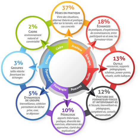 Ce qui aide les participantes et participants à apprendre en formation correspond aux méthodes et approches pédagogiques soutenus dans le référentiel pédagogique de ce programme de formation. Elles et ils apprécient particulièrement la mise en pratique, les temps d’échanges entre participant-es, et les outils, ressources et supports pédagogiques fournis. L’autre élément souligné dans cette évaluation est la qualité des formateur-trices et intervenant-es. Sont notamment appréciées leurs postures et leurs pédagogies.